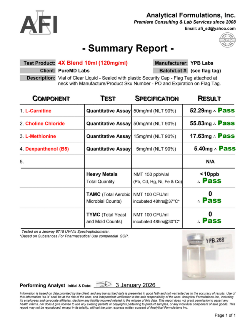 A multi-component research material supplied for controlled research environments. This 4X blend combines Methionine, Choline Chloride, Carnitine, and Dexpanthenol in a single research vial, supporting advanced studies of amino acid and lipid metabolism in model systems.