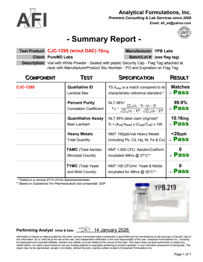 Each lot is sourced through our verified global supply chain with emphasis on traceability and quality control. We work diligently to obtain and maintain third-party analytical reports (HPLC/LC-MS) and Certificates of Analysis for each batch, as part of our ongoing quality process. These documents are reviewed internally and displayed as they become available. Independent third-party testing is also performed on select lots to confirm identity, purity, and alignment with our internal specifications.
