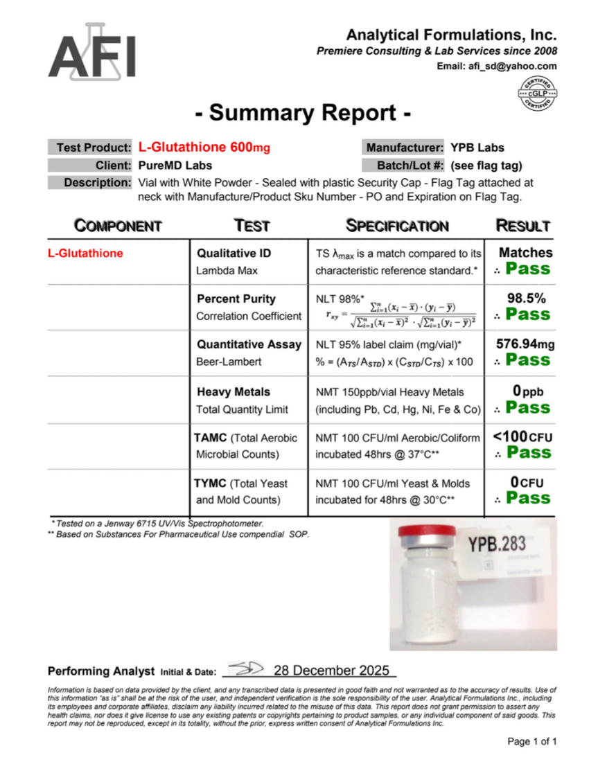 A single-component research material supplied for controlled research environments. Glutathione (600 mg) is a tripeptide (γ-L-glutamyl-L-cysteinylglycine) widely studied for its role in redox regulation, detoxification pathways, and cellular defense mechanisms. This preparation is intended for research use in biochemical and pharmacological model systems.