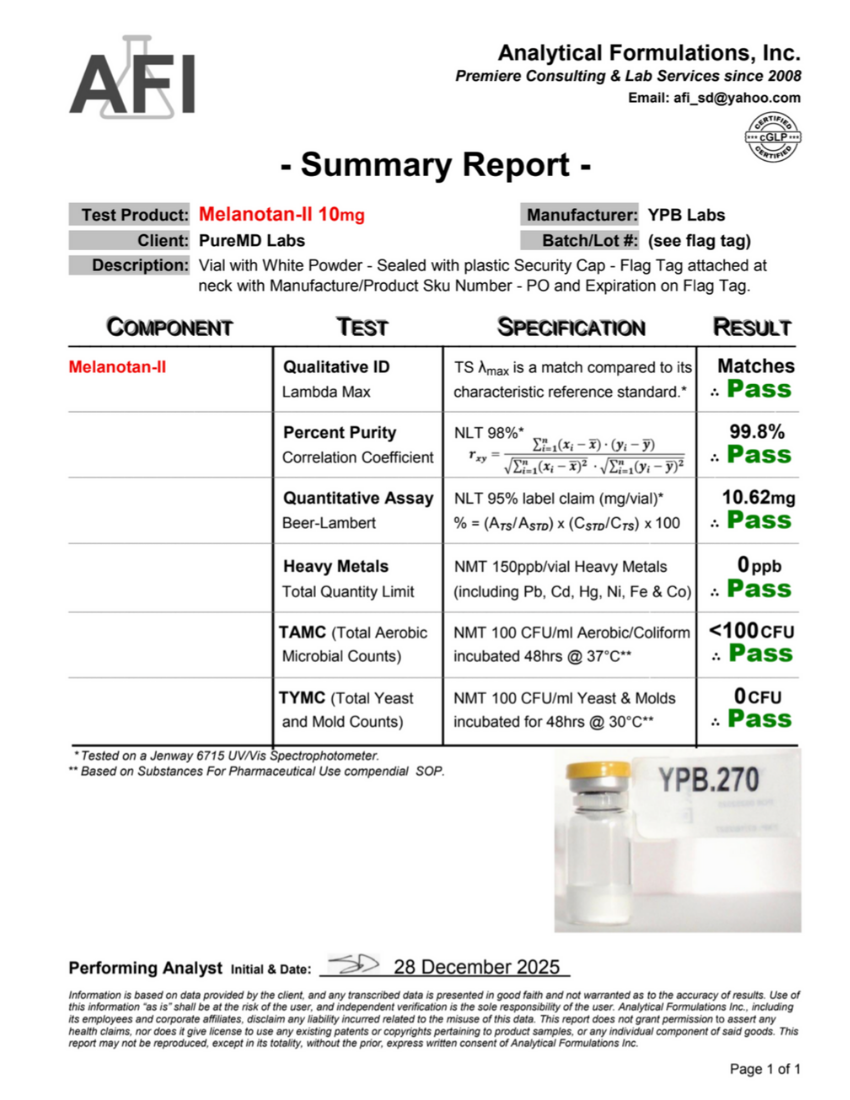 Each lot is sourced through our verified global supply chain with emphasis on traceability and quality control. We work diligently to obtain and maintain third-party analytical reports (HPLC/LC-MS) and Certificates of Analysis for each batch, as part of our ongoing quality process. These documents are reviewed internally and displayed as they become available. Independent third-party testing is also performed on select lots to confirm identity, purity, and alignment with our internal specifications.