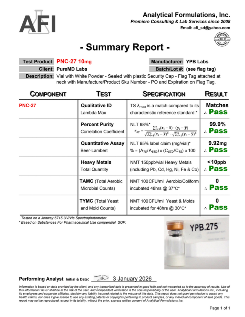 A single-component research material supplied for controlled research environments. PNC 27 (10 mg) is a synthetic peptide used in research exploring p53-related signaling, cell membrane interactions, and peptide-mediated cell targeting mechanisms in preclinical model systems.