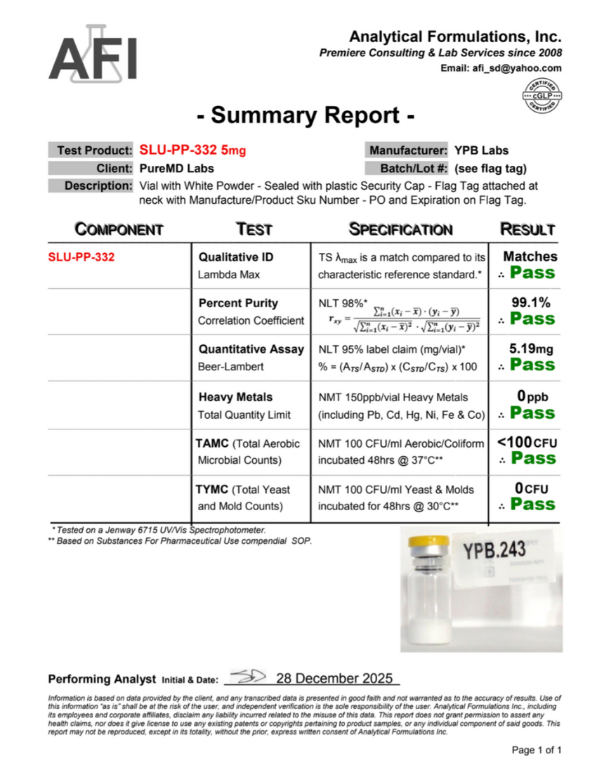Each lot is sourced through our verified global supply chain with emphasis on traceability and quality control. We work diligently to obtain and maintain third-party analytical reports (HPLC/LC-MS) and Certificates of Analysis for each batch, as part of our ongoing quality process. These documents are reviewed internally and displayed as they become available. Independent third-party testing is also performed on select lots to confirm identity, purity, and alignment with our internal specifications.